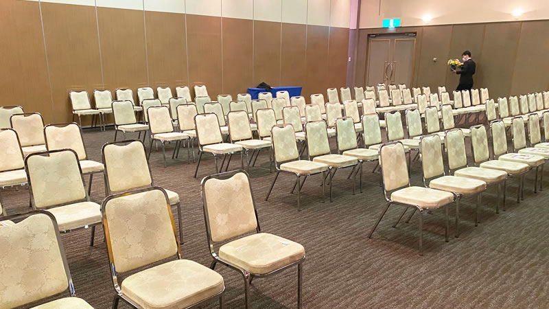 市内随一の広さを誇るホールと設備、リーズナブルな価格設定 大人数収容の会場のほか、広いステージ、講師控室、楽屋、待合室等を併設した充実の館内。横断幕、プロジェクター、巨大スクリーン、AV機器等、各種設備をお手頃価格でご用意致します。
